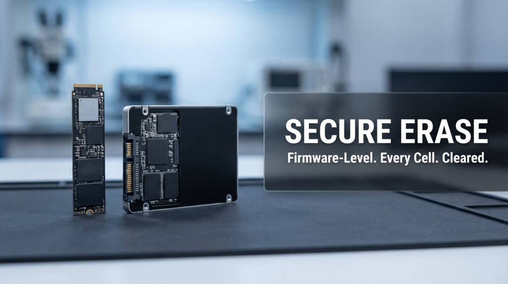 Most modern SSDs support a command called Secure Erase (ATA Secure Erase or NVMe Secure Erase). This isn’t a software overwrite โ it’s a firmware-level instruction that tells the drive to reset every single cell, including wear-leveled and reserved sectors that overwrite tools can’t touch.
