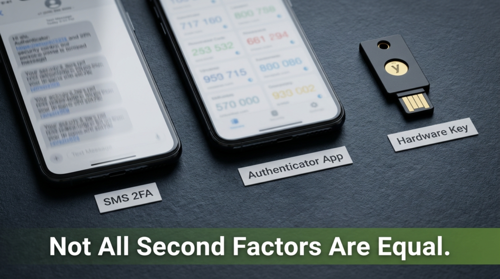 SMS is the weakest option. A SIM swap attack — where a criminal convinces your carrier to transfer your number — completely bypasses it. Authenticator apps are significantly better, but the code still gets typed into a browser, which means a sophisticated phishing kit can intercept it in real time. Hardware keys eliminate that attack path entirely.