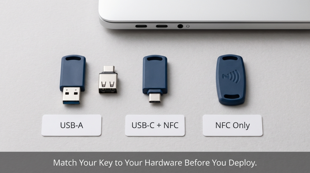 Buying a USB-C + NFC version upfront covers the most scenarios. If budget requires USB-A keys, keep a USB-A to USB-C adapter physically attached to each key. This sounds minor until someone can’t log in because they don’t have an adapter at 2am during a server issue.