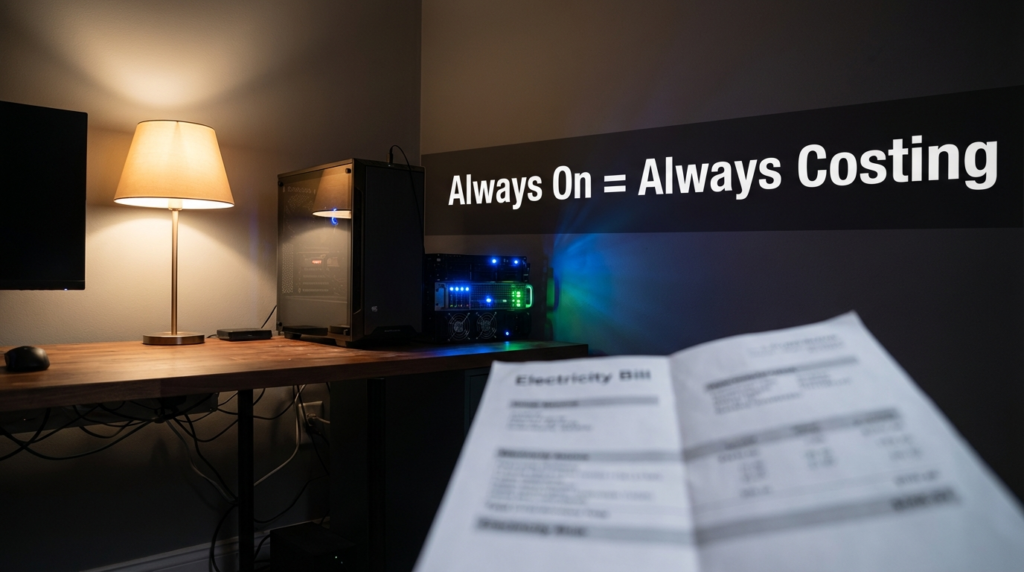 The fix isn’t complicated. Measure your actual power draw with a cheap plug-in meter. Calculate your annual operating cost using your real electricity rate. Then decide whether the hardware you’re running is actually the right tool for the job — or whether something smaller and more efficient would serve you just as well for a fraction of the operating cost.