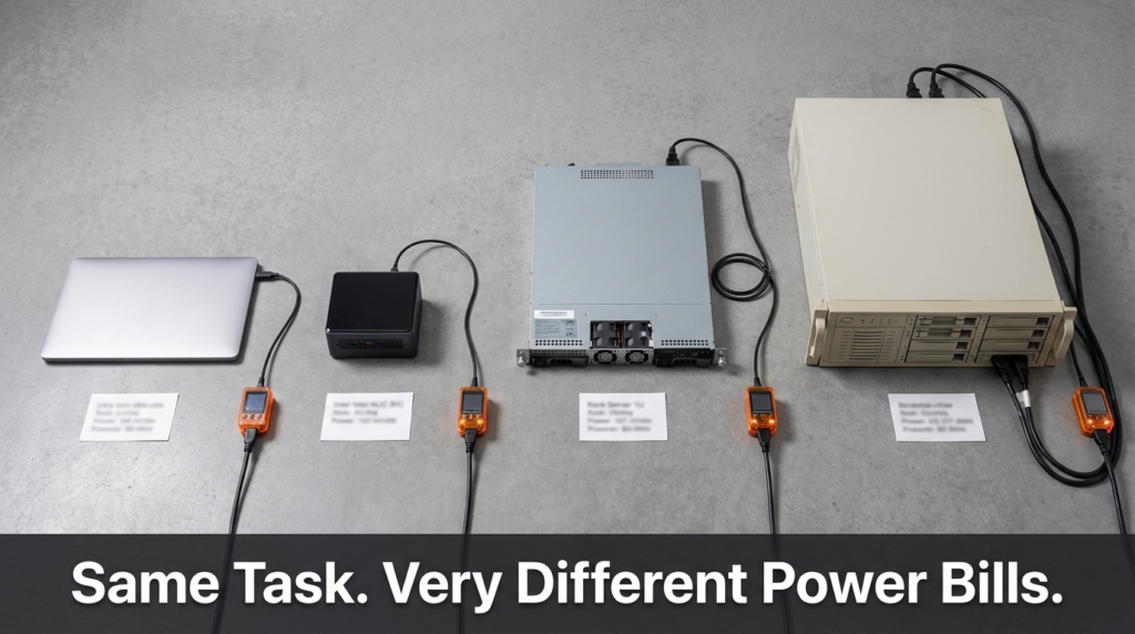 The difference between a modern mini PC and an old enterprise server is roughly $180–$310 per year — just in electricity. That’s not accounting for the cost of cooling the room those machines heat up.