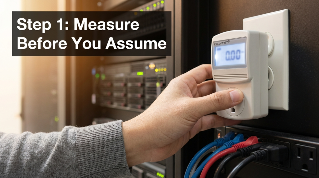The right tool is a plug-in power meter — something like a Kill-A-Watt or similar device. You plug it between the wall outlet and your server, and it reads actual wattage in real time. This takes about two minutes and gives you accurate numbers.