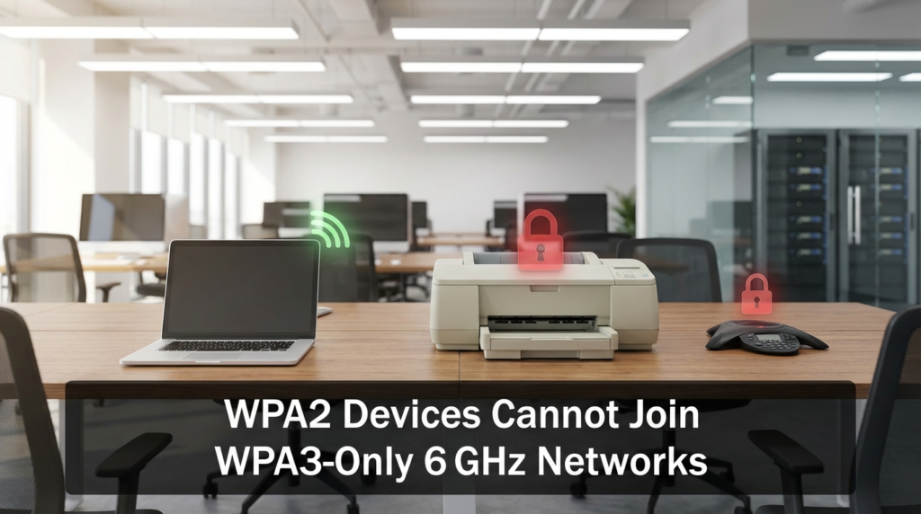 This one bites offices more than they expect. Wi-Fi 6E networks operating on the 6 GHz band are required by the Wi-Fi Alliance to use WPA3. According to the Wi-Fi Alliance’s Wi-Fi 6E specifications, the 6 GHz band is WPA3-only, which means WPA2 devices simply cannot connect to it.