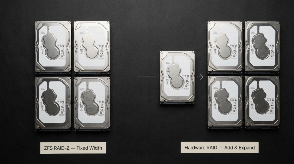 With ZFS RAID-Z (ZFS’s equivalent of RAID 5), you cannot easily add a single drive to expand the pool. A RAID-Z vdev has a fixed width — once it’s created with four drives, it stays four drives. To grow, you either add an entirely new vdev (which changes the pool’s fault tolerance geometry) or you replace all drives with larger ones and wait for the pool to expand after each replacement.